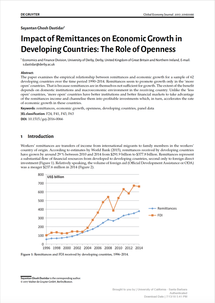 The paper examines the empirical relationship between remittances and economic growth for a sample of 62 developing countries over the time period 1990–2014. Remittances seem to promote growth only in the ‘more open’ countries. That is because remittances are in themselves not sufficient for growth. The extent of the benefit depends on domestic institutions and macroeconomic environment in the receiving country.