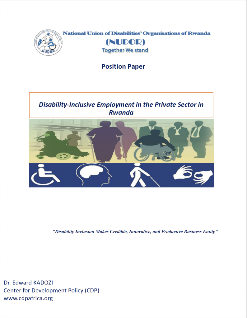 This position paper advances a critical impetus for promoting the employability of persons with disability (PwDs) in the private sector in Rwanda. Is it socially and economically relevant to promote disability-inclusive employment in the private sector? If the answer is YES, by doing so, we are enormously contributing to Rwanda’s inclusive development through the disability-inclusive employment, which in turn increases the innovation, productivity and competitiveness of the business community.